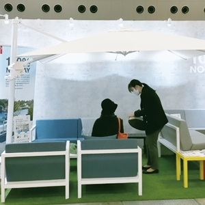 屋外用ガーデンファニチャー「サンデイズ」は、100%ノルウェー製品として、これまでの屋外向けファニチャーを凌ぐ高い耐候性が特徴的。特にクッションは透水性・速乾性に優れており、紫外線にも強く色褪せが少ないのが特長。さらに、雨でもクッションはしまわずに屋外へ置いたままでOK。丸洗いも可能で常に清潔を保てるのも魅力。弊社ブースでは実際に座りながら体感することが可能。