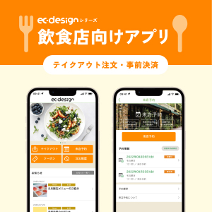 飲食店向けアプリ「ec-design」は、アプリからテイクアウトの注文や来店予約ができるほか、クーポンやスタンプ機能などで独自のサービスを行い、お客様にプッシュ型のアプローチができる機能を有しています。