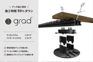 〜デッキ施工革命〜 ・革新的固定クリップの施工性で施工時間50%ダウン ・ワンタッチ取付、ビス固定無し ・国産桧エステクウッドの高耐久性 ※同じGradシステムを使用した外壁用のファサードラタンも開発中で、会期中は参考展示予定。