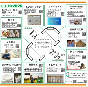 今ある資源を最大限利用するために。企業のサーキュラーエコノミー(循環経済)の取組を支援するワンストップ支援拠点である当センター特設ブースに、埼玉県内企業や埼玉県内でサーキュラーエコノミーに取り組む企業10社が、資源循環に配慮した各種製品・技術・サービスを展示。