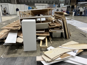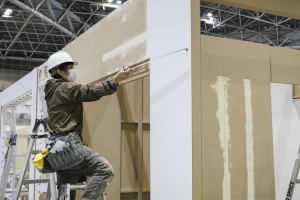 【木工ブースの新構法の提案】展示会業界では、展示会終了後に多くの木材が廃棄されています。この廃棄量を削減するためには、「木工ブース」そのものを無くさなければいけませんが、現実的にそれは難しいと当社では考えています。今回提案する構法は、木工ブースの利点と製造体制をほぼ変えず、使用する素材だけを「置き換える」という「発想の転換」で、木材廃棄量を限りなくゼロに近づけることが大きな特徴です。