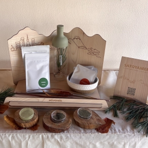 大地再生の里山素材でつくる“習慣型リジェネラティブティー”を紹介するティースタンドです。
