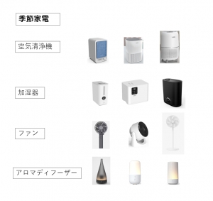 ・Seasonal Appliances: Air Purifiers, Humidifiers, Aroma Diffusers, Circulators, Electric Fans