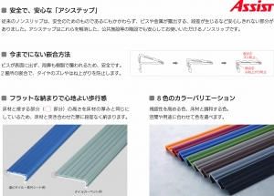 あしもとカナモノ専門メーカーとして半世紀の歴史を有する㈱アシストでは、今回2つのブランドを展示する。内装工事に関わる方々の視点を大切に考えた施工しやすく丈夫で高品質なブランド「ASSIST」と、建築家・意匠設計者のためのシンプルなデザインを求めた今までにないブランドの「AFOLA」を1つのブースで2つの世界観を紹介する。