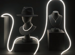 自然界の心地よいリズムを再現する「1/fゆらぎモジュール」や存在感のある光のラインを自在に描く全周発光チューブ「TUBE360」。環境に配慮したリサイクルアクリルを用いたLEDのネオンアートなど商業施設や店舗のアイキャッチとして、またデザイナーの感性を刺激する「ひかりの素材」として提案。