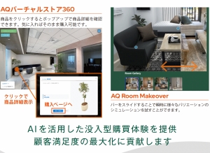 AI-powered retail solutions that recreate products and spaces from smartphone photos. "AQ Virtual Store 360" enables shopping for 3D-modeled products in virtual stores, while "AQ Room Makeover" offers chat-based room simulations with personalized furniture recommendations. Both drive maximum customer satisfaction through immersive UX.