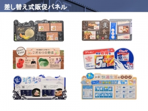 スーパーマーケットやホームセンター、ドラッグストアなど小売量販店の企業様向けに、店頭販促物の製造をご提案。トップボードやタペストリー、スポッター、スイングPOP、腰巻、フロアシートなど、店舗で使用されるあらゆる販促物の印刷が可能。さらにデザインから加工、複数拠点ごとの仕分け、保管・発送まで対応するので、自社スタッフの業務負荷軽減や販促物の短納期を実現する。さらに新店や改装ニーズにも対応。